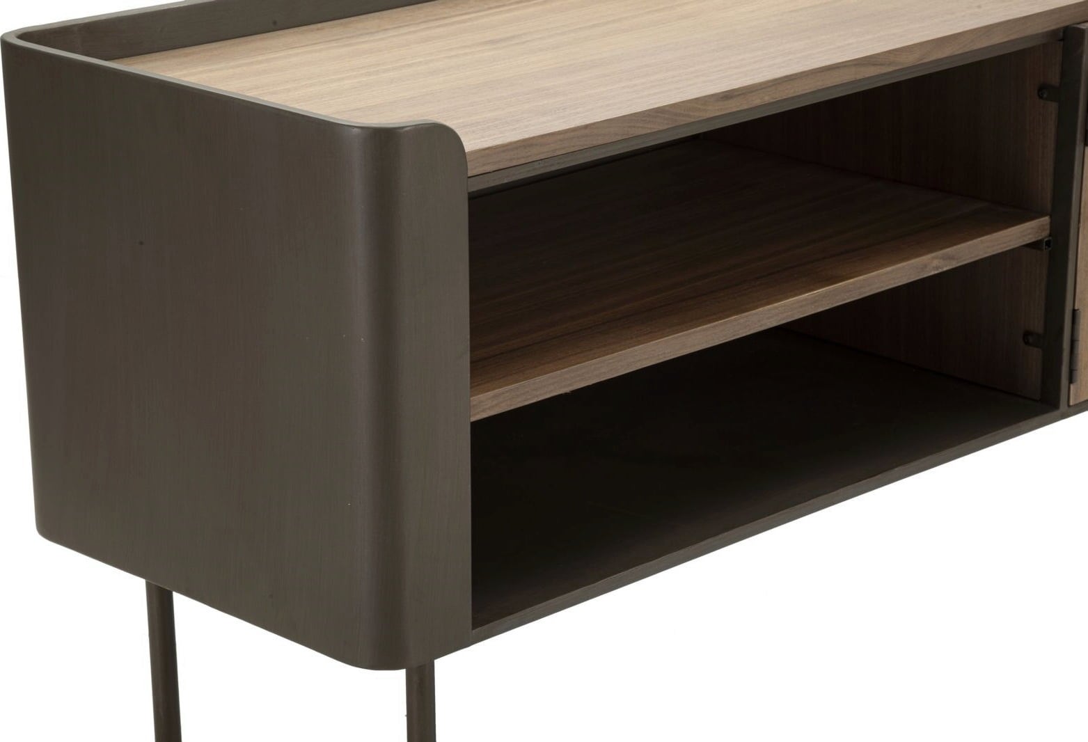 Setze dein Home-Entertainment-System stilvoll in Szene mit diesem modernen TV-Ständer! Sein besonderes Design besticht durch die Kombination aus robuster, dunkler Metallstruktur und warmer Holzoptik, was ihm eine ansprechende, industriell inspirierte Eleganz verleiht. Die schlichten, klaren Linien machen ihn zur perfekten Ergänzung für jede moderne Einrichtung.
