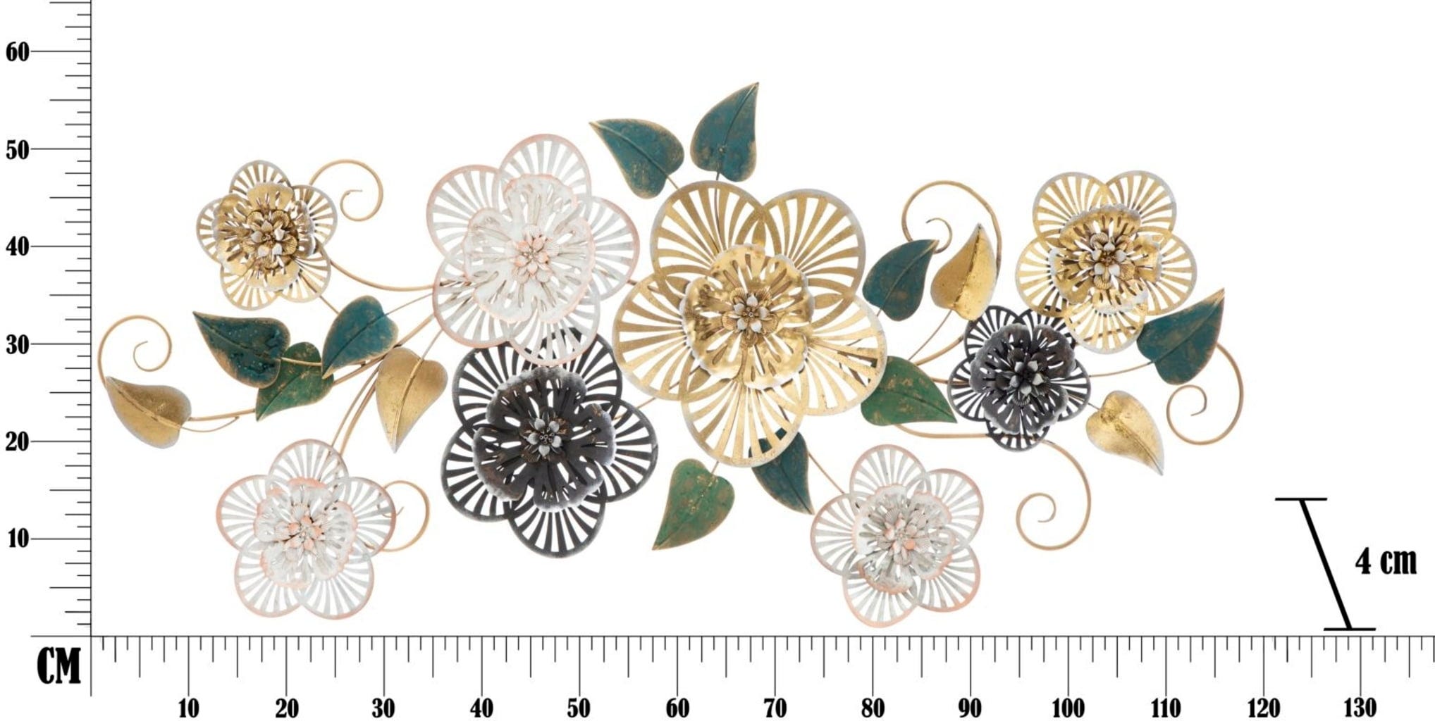 Setze ein glanzvolles Highlight mit der Wanddekoration Campur -B- von Mauro Ferretti. Dieses weitläufige 3D-Metallpaneel fängt die Schönheit eines blühenden Gartens ein und verwandelt sie in ein luxuriöses Kunstwerk für deine Wand. Das Design besticht durch filigrane, fächerartig gestaltete Blüten in Gold, Creme und dunklen Akzenten, die durch smaragdgrüne Blätter in Antik-Optik harmonisch ergänzt werden.
