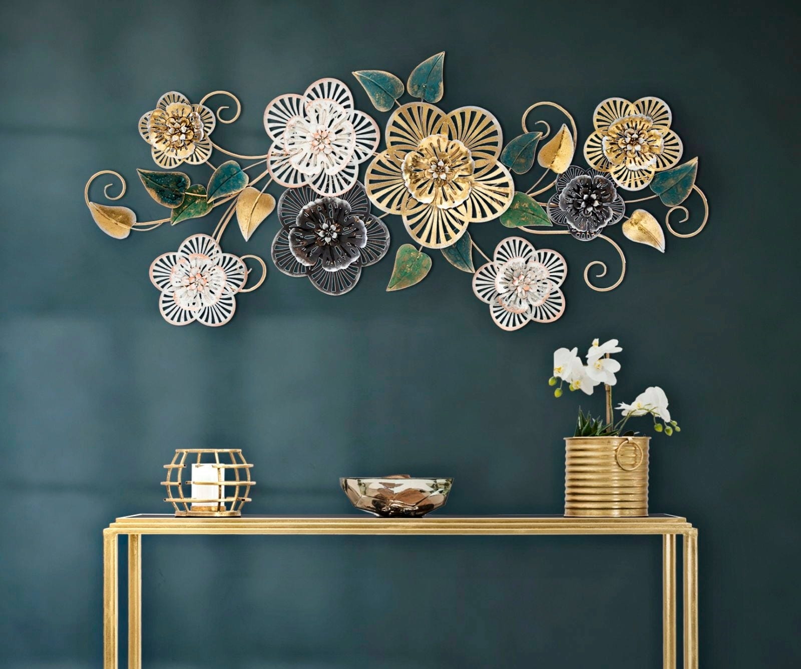 Die plastische 3D-Ausarbeitung und die zarten Metallranken erzeugen eine überraschende Tiefe und verleihen jedem Raum sofort einen Hauch von Glamour. Ob über dem Sideboard oder als zentraler Blickfang im Wohnzimmer – Campur -B- ist die perfekte Wahl für alle, die florale Eleganz und exklusives Design formvollendet vereinen möchten.