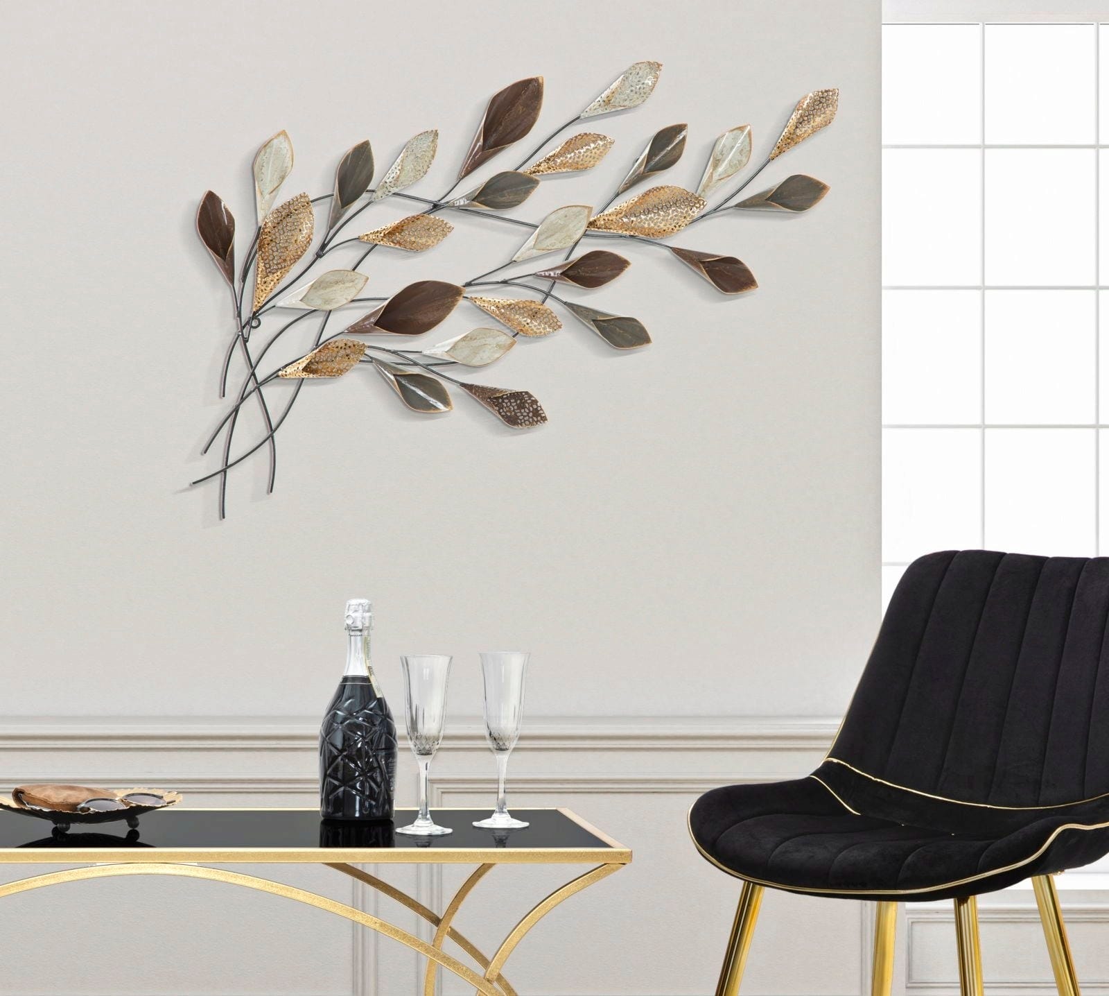 Verleihe deinem Raum eine lebendige und zugleich luxuriöse Atmosphäre mit der Wanddekoration Ramo von Mauro Ferretti. Dieses beeindruckende 3D-Metallpaneel bricht mit konventionellen Formen und bringt eine überraschende Dynamik an deine Wand. Die naturnahe Gestaltung erinnert an sanft im Wind wehende Zweige, bestückt mit kunstvollen, kelchförmigen Blättern.