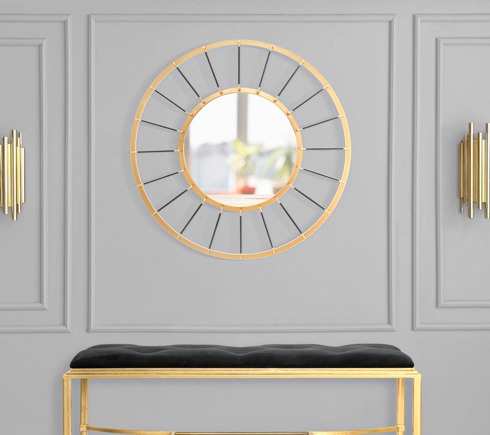 Mit dem Wandspiegel Glam Dark von Mauro Ferretti holst du dir ein echtes Design-Statement an deine Wand, das durch sein raffiniertes Spiel mit Farben und Formen besticht. Der edle, goldfarbene Doppelrahmen bildet die perfekte Bühne für die linearen schwarzen Metallstreben, die wie feine Strahlen das Zentrum fokussieren und dem Spiegel eine bemerkenswerte Dynamik verleihen.