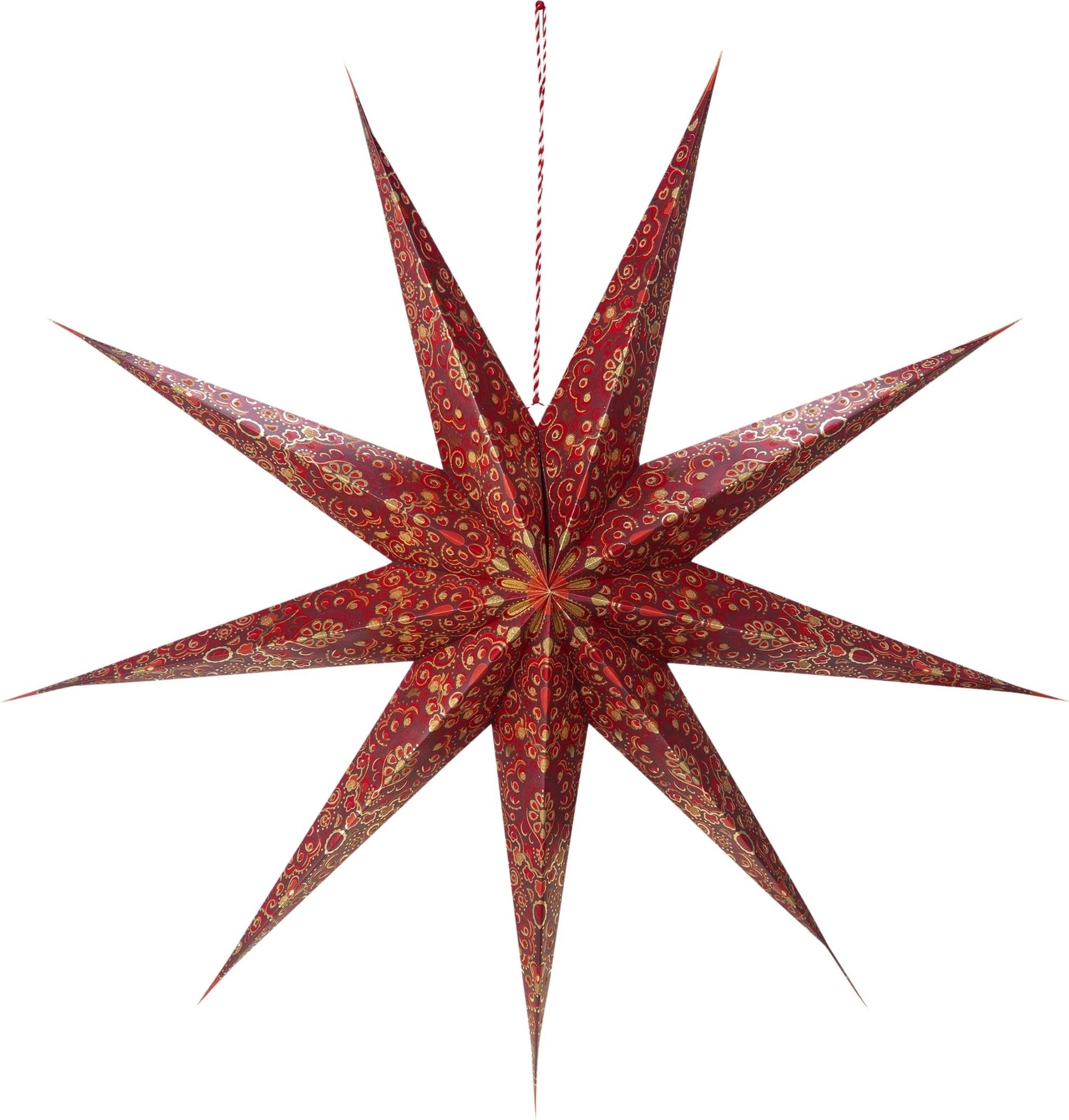 Er besticht durch sein elegantes und gleichzeitig filigranes Design, für welches ein eleganter, tiefer Rotton die Grundlage bildet. Aufwändige Musterungen in luxuriösem Gold und dunklerem Rot verleihen dem Design seinen festlichen Charakter. Die sorgfältig gefalteten, spitzen Zacken verleihen dem Stern eine beeindruckende dreidimensionale Tiefe und eine anmutige Form.
