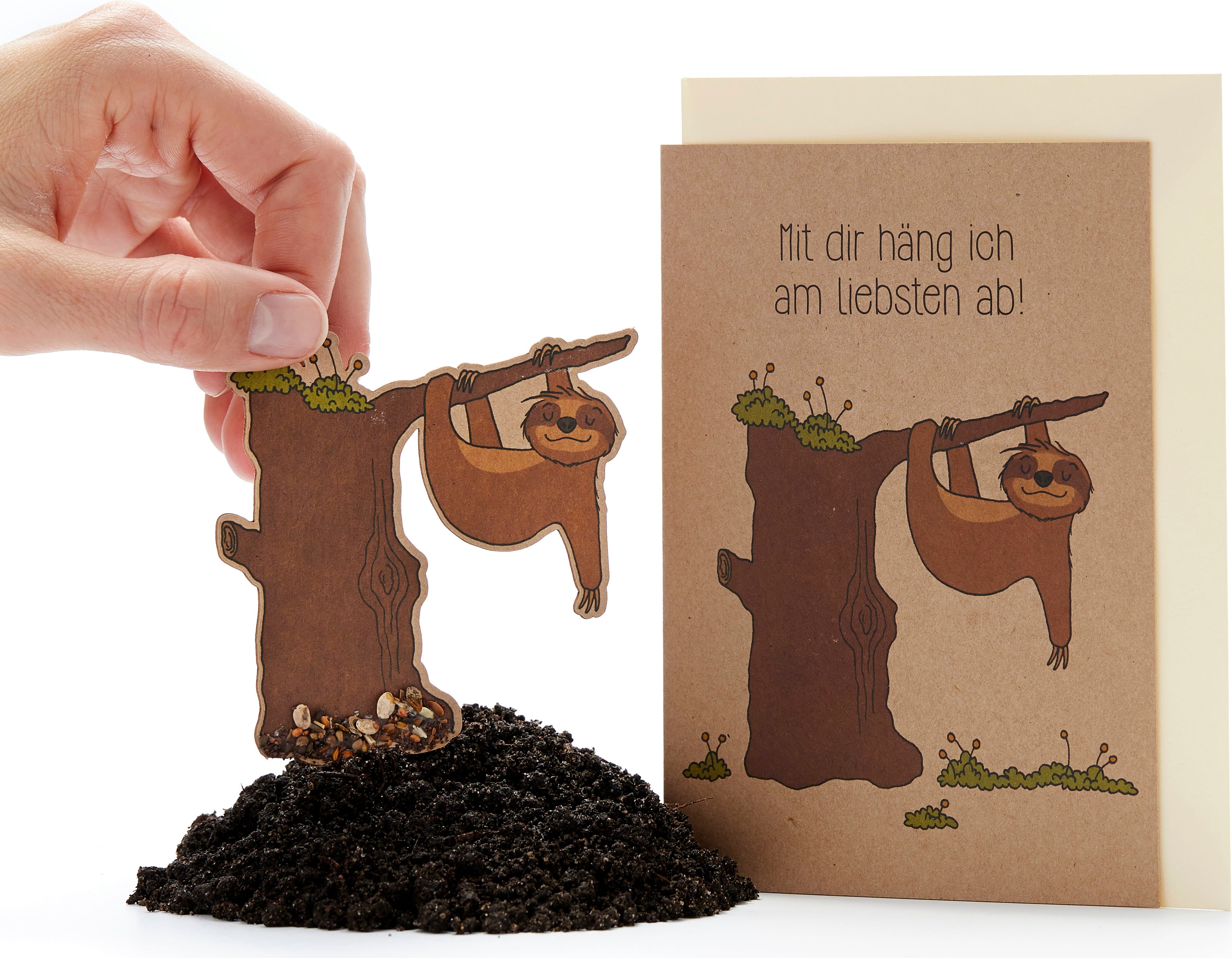 Da das Faultier zusätzlich auf die Karte gedruckt ist, bleibt das Motiv auch nach dem Entfernen des Saatpapiers erhalten.