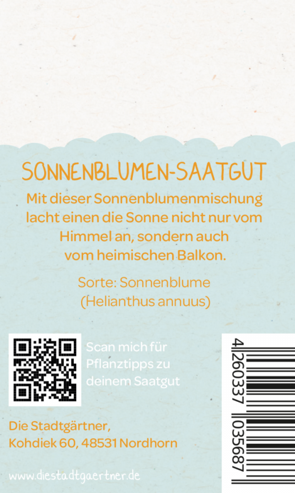 Dieser Saatgruß enthält Sonnenblumensaatgut (Helianthus annuus). Dieses kannst du im März im Haus in einen Topf aussäen und die Pflanzen nach den Eisheiligen ins Freie umsetzen. Ab April kannst du die Samen auch direkt ins Freiland säen. Sonne, ein nährstoffreicher Boden, viel Wasser und etwas Dünger lassen deine Sonnenblumen kräftig wachsen.