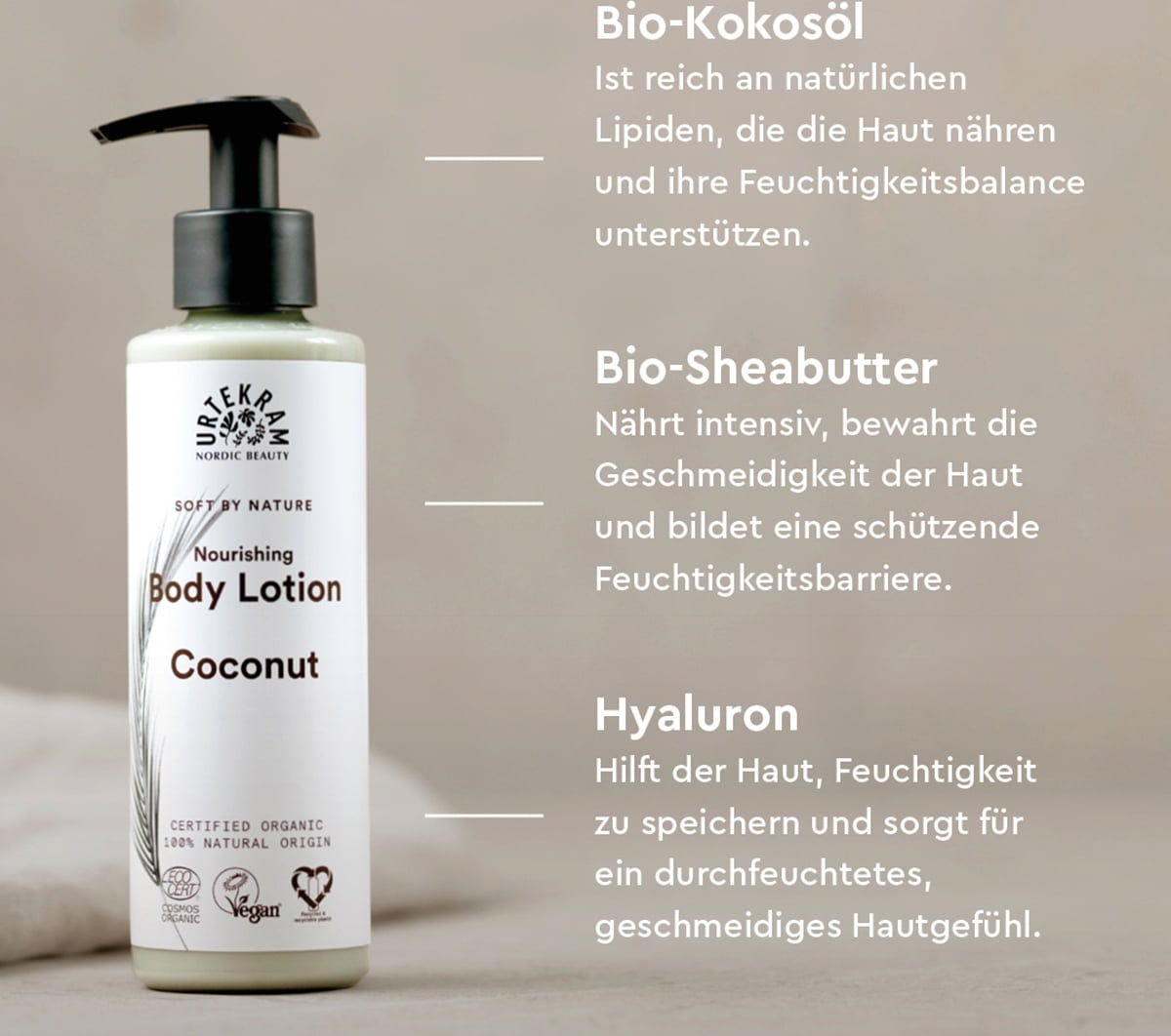 Diese Körperlotion umhüllt die Haut während der Pflege mit dem Duft nach Kokosnuss. Ihre Formulierung mit Aloe Vera, Sheabutter und Ölen aus Kokos und Jojoba versorgt die Haut mit Nährstoffen und bietet belebende Eigenschaften. Zusätzlich enthält sie feuchtigkeitsspendende Hyaluronsäure.
